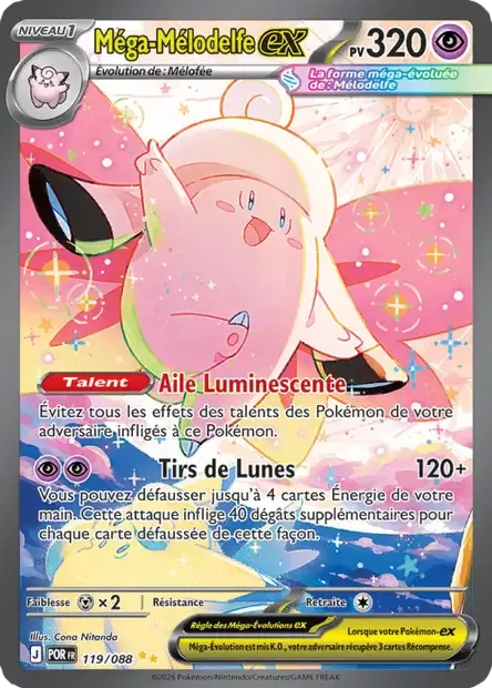 Difficile de passer à côté de cette Méga-Mélodelfe ex, une carte qui apporte une vraie touche de fraîcheur à Équilibre Parfait. Avec ses 320 PV, elle combine parfaitement solidité et élégance, tout en proposant un visuel coloré et lumineux qui attire immédiatement l’œil. Son talent Aile Luminescente la rend particulièrement intéressante en jeu, tandis que son attaque Tirs de Lunes peut rapidement faire basculer une partie. Mais au-delà du gameplay, c’est surtout son illustration féerique et ultra soignée qui fait la différence, avec ce style brillant très apprécié des collectionneurs. C’est typiquement le genre de carte qui séduit autant pour sa beauté que pour son potentiel, et qui pourrait bien devenir une valeur sûre de l’extension.