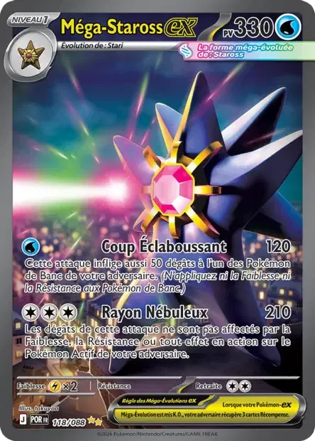 Cette Méga-Staross ex s’impose comme une des cartes les plus impressionnantes visuellement d’Équilibre Parfait. Avec ses 330 PV, elle affiche une solidité exceptionnelle, tout en proposant un design à la fois élégant et percutant. Son illustration cosmique, avec ce faisceau lumineux qui traverse la carte, attire immédiatement l’œil et lui donne une vraie présence dans une collection. Côté jeu, ses attaques Coup Éclaboussant et Rayon Nébuleux offrent un excellent équilibre entre pression et régularité. Mais au-delà de ses performances, c’est clairement son style unique qui fait la différence. Ce genre de carte, à la fois puissante et visuellement marquante, a tout pour devenir une pièce très recherchée sur le long terme.