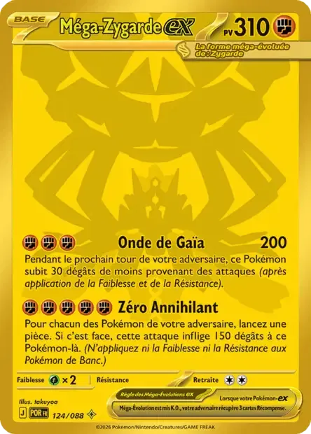 Impossible de passer à côté de ce Méga-Zygarde ex, qui s’impose déjà comme une des cartes les plus marquantes d’Équilibre Parfait. Avec ses 310 PV, on est face à un Pokémon impressionnant, aussi redoutable en jeu que recherché en collection. Son design entièrement doré capte immédiatement l’attention et lui donne ce côté ultra premium que les collectionneurs apprécient particulièrement. Entre sa puissance brute et des attaques comme Onde de Gaïa ou Zéro Annihilant, tout est réuni pour en faire une carte très convoitée. C’est clairement le genre de pièce qui peut prendre de la valeur avec le temps, et si vous devez en surveiller une dans cette extension, celle-ci mérite largement votre attention.