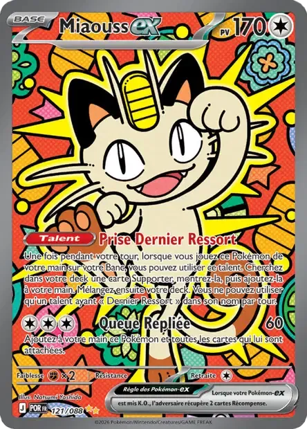 Cette Miaouss ex ne passe clairement pas inaperçue dans Équilibre Parfait, avec un style visuel ultra coloré qui tranche complètement avec le reste de l’extension. Ici, ce n’est pas la puissance brute qui impressionne le plus, mais plutôt son originalité et son côté fun, très apprécié des collectionneurs. Son talent Prise de Dernier Ressort apporte une vraie utilité en jeu, tandis que son attaque Queue Repliée reste efficace dans certaines situations. Mais ce qui fait vraiment la différence, c’est son illustration dynamique et presque artistique, qui lui donne une identité unique. C’est typiquement le genre de carte qui peut créer la surprise et devenir recherchée, surtout auprès de ceux qui aiment les pièces atypiques.